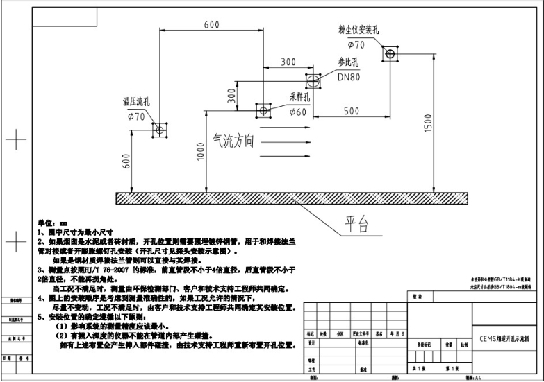 煙氣在線監(jiān)測系統(tǒng)在煙囪上的開孔位置大概在:煙囪直徑的4倍處(變徑之上),根據(jù)煙囪氣流的方向,從左往右開孔依次是:溫壓流孔、氣體采樣孔、環(huán)保參比孔、粉塵(顆粒物)取樣孔、濕度孔5個(gè)取樣孔??讖降拇笮。簻貕毫骺?0mm/采樣孔60mm/參比孔80mm/粉塵孔70mm。