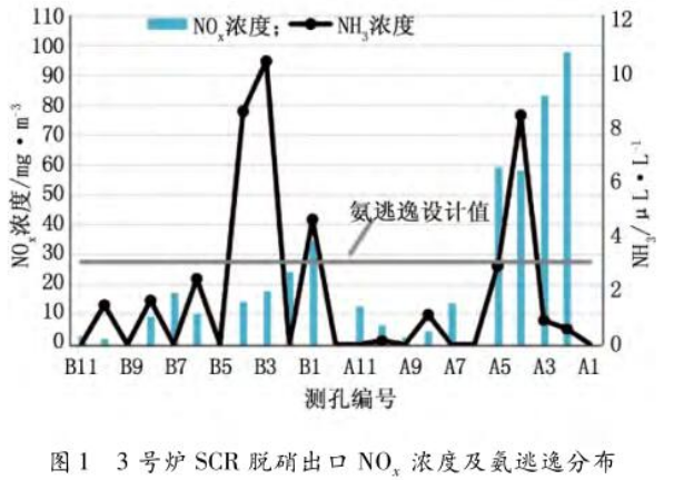 圖1 3號(hào)爐SCR脫硝出口NOx濃度及氨逃逸分布