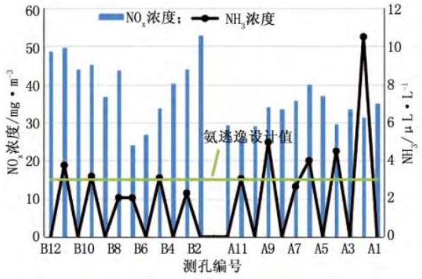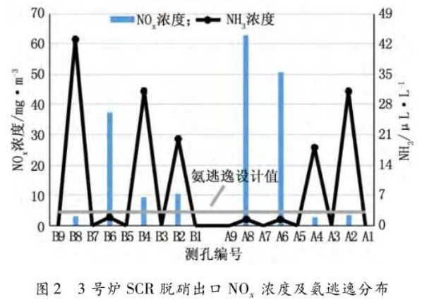 圖2 3號(hào)爐SCR脫硝出口NOx濃度及氨逃逸分布
