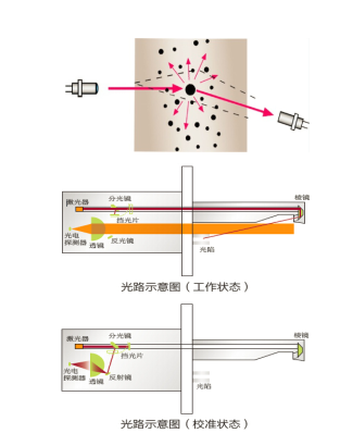 Sdust-100型煙塵濃度監(jiān)測儀采用激光后向散射測試原理完成對被測煙道的煙塵濃度的測定。Sdust-100其內嵌的高穩(wěn)定激光信號源穿越煙道,照射煙塵粒子,被照射的煙塵粒子將反射激光信號,反射的信號強度與煙塵濃度成正變化。Sdust-100檢測煙塵反射的微弱激光信號,通過特定的算法即可計算出煙道煙塵的濃度。