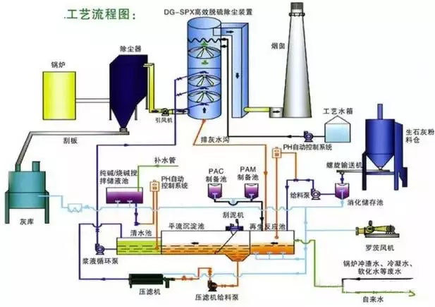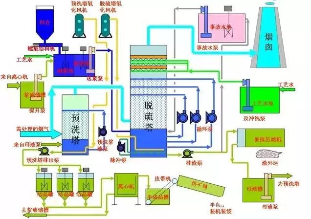 該工藝主要由脫硫洗滌系統(tǒng)、濃縮系統(tǒng)、煙氣系統(tǒng)、氨貯存系統(tǒng)、硫酸銨生產(chǎn)系統(tǒng)(若非氨-硫銨法則是于其工藝相對應(yīng)的副產(chǎn)物制造系統(tǒng))、電氣自動控制系統(tǒng)等組成。