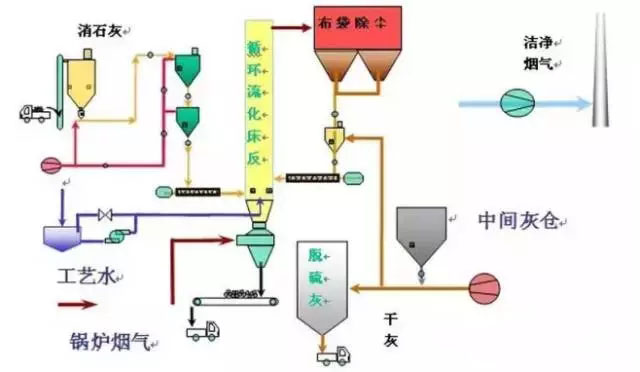 脫硫反應(yīng)后的產(chǎn)物以干態(tài)粉末形式從分離器中吹出。這種脫硫技術(shù)應(yīng)用石灰石或消石灰做脫硫劑。具有很高的脫硫率及脫硫劑利用率,而且對環(huán)境的影響很小。