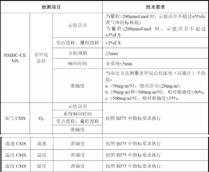 1) 分析周期;2) 響應時間;3) 零點漂移、量程漂移;4) 示值誤差;5) 準確度;6) 氧氣CMS零點漂移、量程漂移;7) 氧氣CMS示值誤差;8) 氧氣CMS系統響應時間;9) 氧氣CMS準確度;10) 流速CMS速度場系數;11) 流速CMS速度場系數精密度;12) 溫度CMS準確度;13) 濕度CMS準確度。